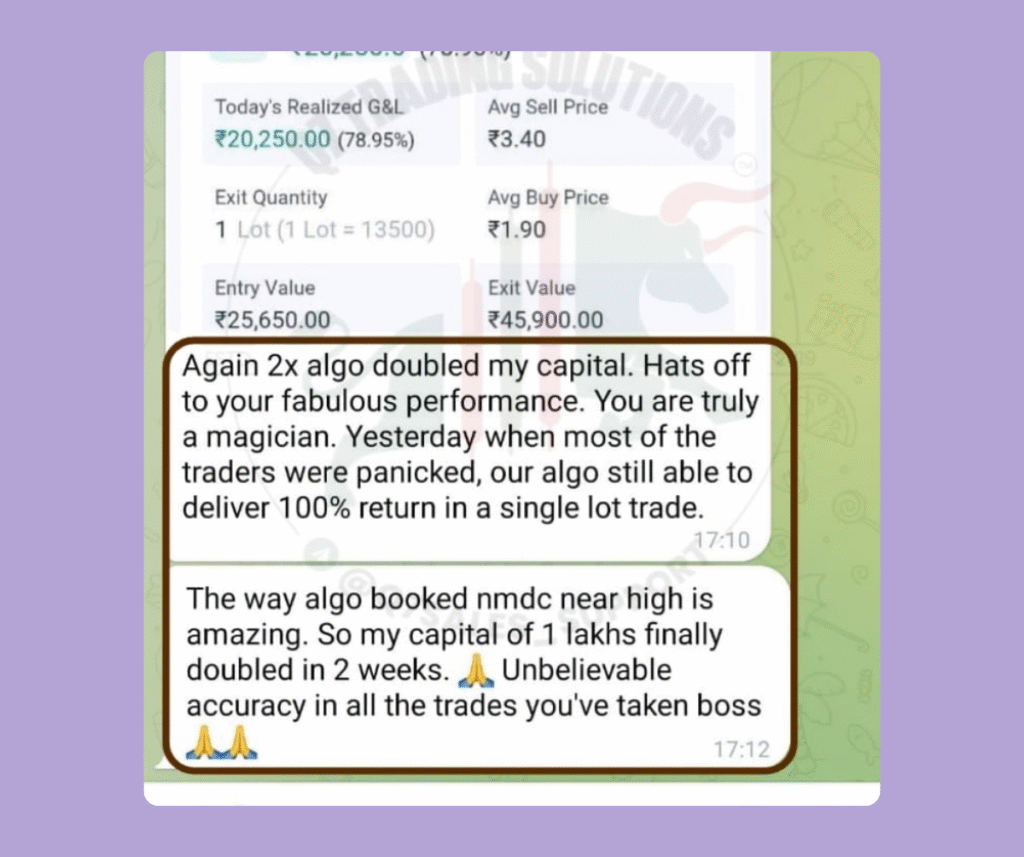 2x Algo Stock | Intraday, Stock options, Index | Rs. 25000 | 2x on investment amount* | Positional / Based on our algorithm | Yes | Professionals | Learn More |
